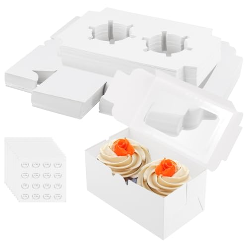 Funsuei 60 stycken 2 cupcake-lådor med fönster och klistermärken, cupcake-muffinslåda vit muffin transportlåda, kaka transportlåda, kartong muffin kartong låda för cupcake