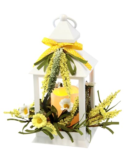 Dekorativ lykta, vit, 23 cm med LED-ljus, batteridriven – vårlykta med mimosor och blommor – påskdekoration, bordsdekoration för vardagsrum, balkong, fönsterbräda, höstdekoration, konstgjorda blommor