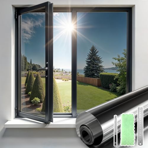Qualsen Fönsterfilm, spegelfilm för fönster utan fläckar, anti-UV, solskydd, icke-självhäftande, elektrostatisk adsorptionsfilm för hem och kontor (svart, silver, 44,3 x 400 cm)