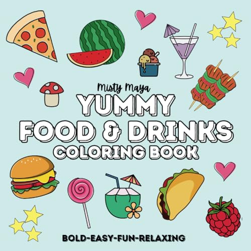Yummy Food and Drinks Coloring Book: Fun, Simple and Relaxing Coloring Pages with Bold Designs and Descriptive Words related to a Variety of Foods and Drinks perfect for Adults, Teens and Kids