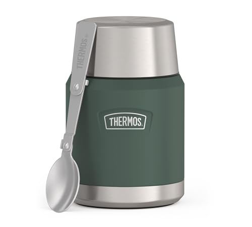 Thermos ICON Food Jar 0,47 l, grön matt/skog, matbehållare för mat 470 ml, dubbelväggigt 18/8 rostfritt stål, håller dig varm och kall, med vikbar sked, halkfritt golv, absolut tät
