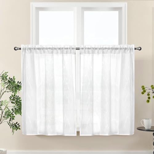 YJ YANJUN vita silvergardiner köksgardiner 114 cm längd metallisk prin korta gardiner för små fönster genomskinliga gardiner 114 cm längd uppsättning av 2 paneler 132 B x 115 L tum vit/silver