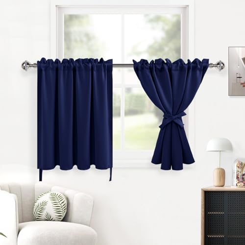LinTimes Blavkout Korta gardiner 113 cm långa för badrumsset 2 paneler stång ficka café nivågardiner ljusblockerande mörkläggning rum mörkläggning husbil gardiner för små fönster kök marinblå