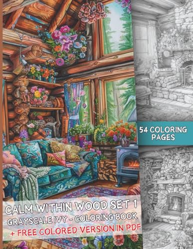 Calm within Wood set 2, 54 Grayscale Coloring Pages + Free Colored Version in PDF - Cabin Wood House - Relaxing Forest House Coloring: Large US Letter format. Fun and relaxation guaranteed.
