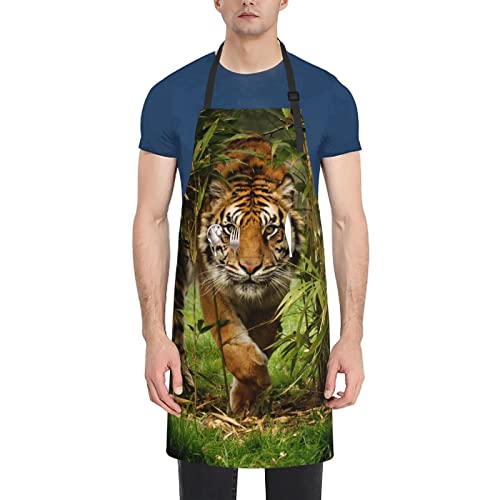 OGNOT Tropiska löv tryck förkläde med fickor justerbara matlagningsförkläden kök haklapp förkläde för bakning hushållsrengöring, Tiger i djungeln, one size