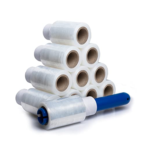 V1 Trade Mini stretchfolie transparent – 40 x stretchfolierulle + dispenser – omslagsfolie – handstretchfolie 150 meter lång och 10 cm bred – förpackningsmaterial – förpackningsfolie på rulle – folie