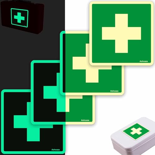 Ashoaza 4 stycken självlysande bil för första hjälpen låda PVC hållbart klistermärke för utomhus och inomhus, 10 x 10 cm första hjälpen-låda skylt, repsäker anti-UV vattentät