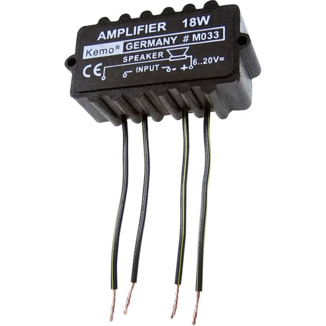 Kemo M034 robust universell förstärkare 40 W. Fukt- och skakningsresistent. Musikeffekt max. 40 W vid 4 ohm högtalarbast vid 12 V driftspänning