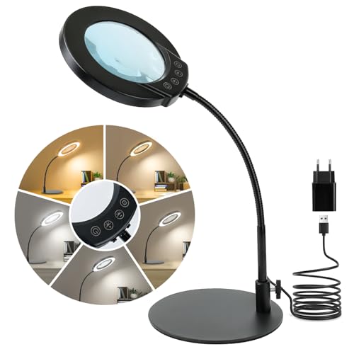 Mucek 10 x förstoringsglas med ljus och stativ, förstoringsglas med LED-belysning och 5 färglägen, lupplampa med flexibel svanhals, steglöst dimbar för hantverk, läsning, närarbete, reparation