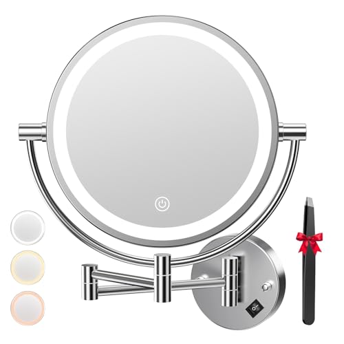 Auxmir Sminkspegel med LED Belysning Väggfäste, 1X/20X Förstoringsspegel, 360° Vridbar på Båda Sidor, Infällbar Badrumsspegel med Pekskärm och Kontakt, 3 Färger, Justerbar Ljusstyrka, Silver
