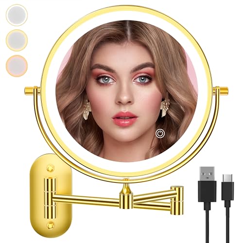 Auxmir Sminkspegel med Uppladdningsbart Ljus, Förstoringsspegel 1X/10X Dubbelsidig 360° Roterande, Utdragbar Badrumsspegel med Touchvägg USB, 3 Färger Justerbar Ljusstyrka, för Hotell, Guld