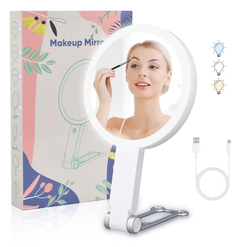 FUNTOUCH Uppladdningsbar resesminkspegel med lampor, förstoringsspegel x 10, bärbar upplyst spegel med 80 LED-lampor, 2 000 mAh batteri, 3 färger belysning, dimning