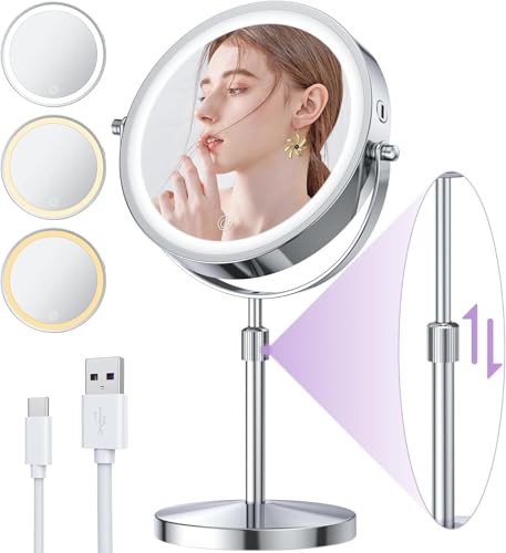 iklestar förstoringsspegel med ljus, justerbar höjd sminkspegel med belysning, dubbelsidig 1 x 10 x sminkspegel med ljus med 3 färgbelysningslägen
