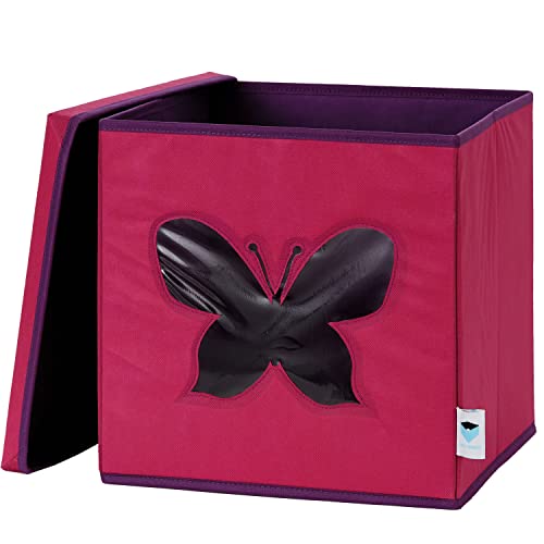 Love it Store it Förvaringsbox med lock – tyglåda för barnrum – med visningsfönster – stabil – rosa med fjäril – 30 x 30 cm