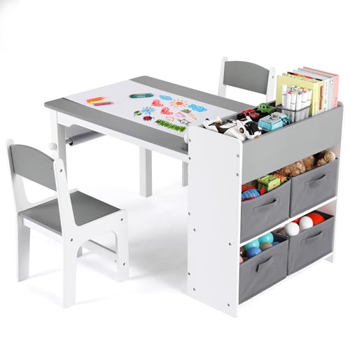 Barnbord med 2 stolar, barnbord med förvaringsutrymme, barnbordsstol set trä, målbord skrivbord med pappersrulle och 4 förvaringslådor, barnstolsgrupp för barnrum dagis, grå