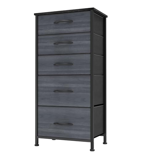 YITAHOME Smal byrå med 5 lådor, tygbyråer med enkelt draghandtag, robust stålram, förvaringslådor för sovrum, barnrum, garderob, kläder, svart träfiber