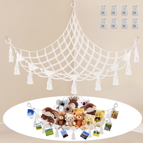 gosedjur förvaringsnät, handvävt nät för gosedjur i böhmisk stil mjukisdjur förvaring, förvaring gosedjur barnrum hörn kan hängas upp, med 8 fotoklämmor (vit)