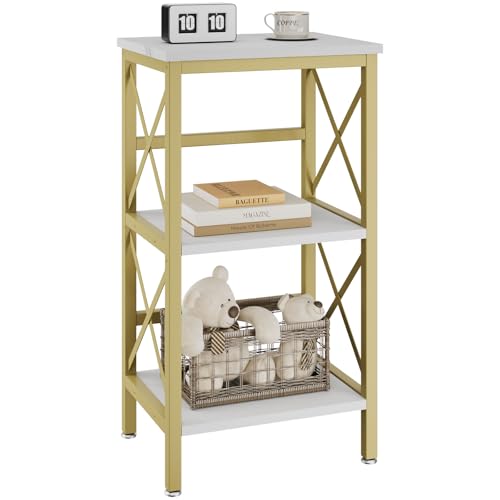 YMYNY Bokhylla, 3 nivåers förvaringsställ, växtställ, förvaring mikrovågsugnshylla med stålram, för vardagsrum, kök, kontor, studierum, 40 × 29 × 75 cm vit marmor och guld HST008W