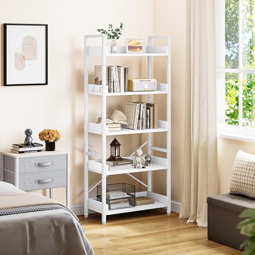YITAHOME Bokhylla, 5 nivåer, golvstående bokhylla, trähyllor och stabil stålram hyllenheter med 4 krokar industriell förvaring för vardagsrum, hemmakontor, rena vita bokhyllor