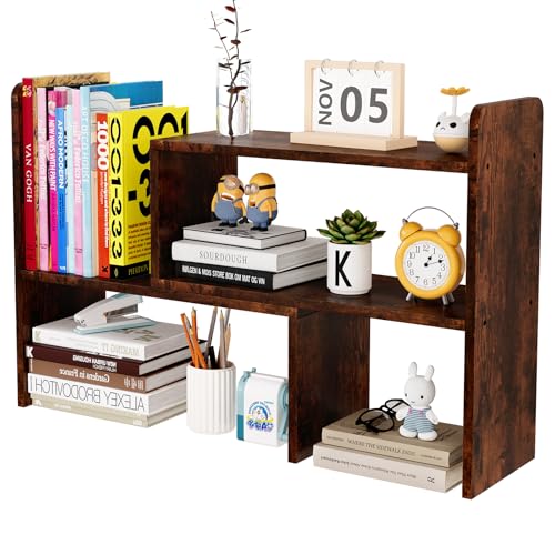 EasyPAG Trä skrivbordshyllor justerbar skrivbord bokhylla fristående liten bokhylla kontorsmaterial förvaring display hylla skrivbord prydlig organisatör, brun