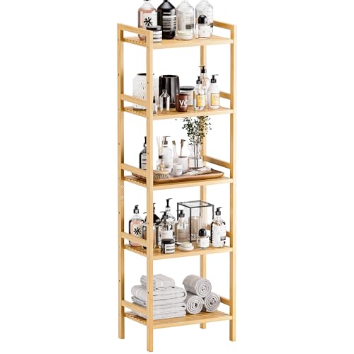 HITNET 5-nivåers bokhylla, bambu bokhylla stor öppen förvaring rack arrangör växt display stativ, fristående badrum hyllor enhet med justerbara hyllor, naturliga