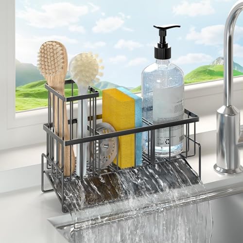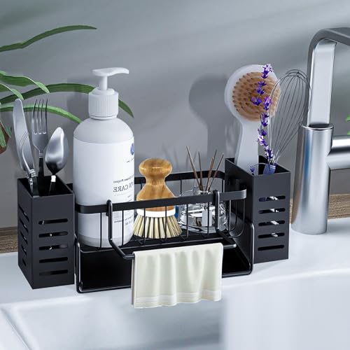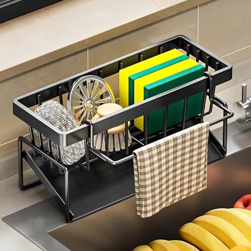 HIYAA Förvaring och organisering av kök, organisatör för diskbänk med automatisk avloppsbricka, kökssvamphållare med handdukshållare-svart