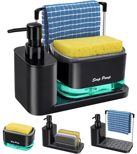 Eavida Kökstvålpumpset med bricka och svamphållare, disk- och handtvåldispenser med disktrashållare, 5-i-1 diskbänk bänkskiva, förvaring, praktiska kökstillbehör – svart