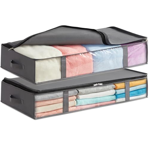Lifewit 75L förvaring under sängen, 2-pack, vikbara förvaringspåsar för kläder med genomskinligt fönster på framsidan, garderobsorganisering och förvaring för handdukar, kläder, täcken, Grå