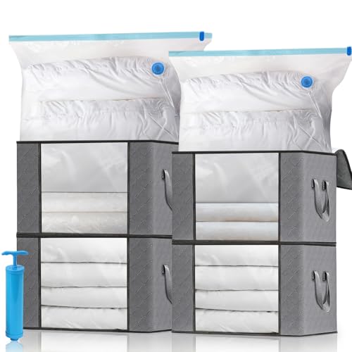 Leavans 4 st förvaringslådor för kläder, 4 vakuumförvaringspåsar och 1 pump, vikbar organisatör, förvaringslåda med förstärkt handtag för förvaring av kläder, täcken, filtar