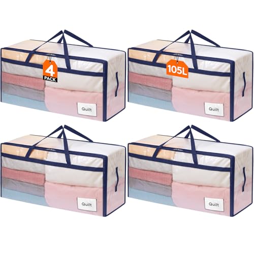 Lifewit Set med 4 stora garderobslådor 110 L, flyttväskor med handtag, vikbar förvaring för täcken, filtar, kläder, transparent