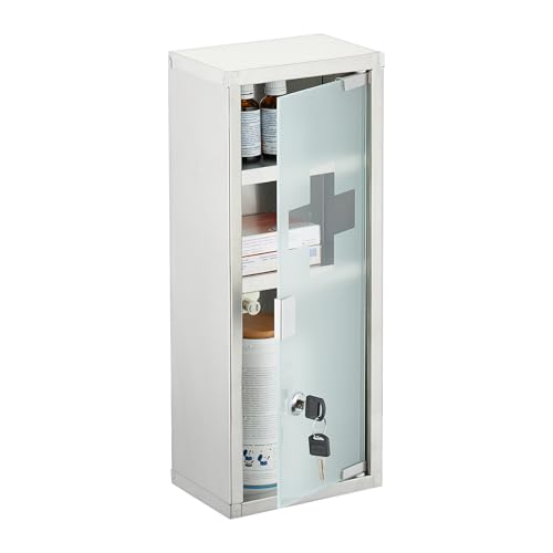 Relaxdays medicinskåp, 3 hyllor, rostfritt stål, första hjälpen-förvaring, frostat glas, 45 x 18 x 12 cm, låsbar, silver