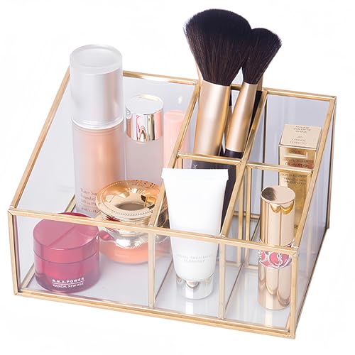 Harliangxy Borsthållare guld – 5 fack – skönhetsorganisatör bricka – vintage sminkborste förvaring – metall och glas, kosmetisk arrangör för nagellack, läppstift, sminkborstar
