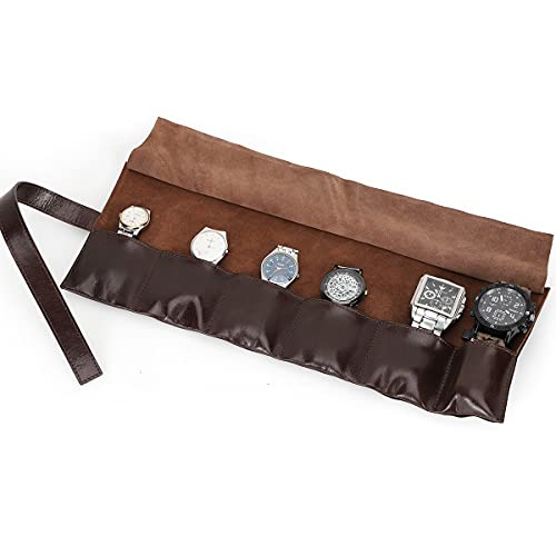 Kontakter äkta läder klockrulle, klockorganiserare bärbar bandväska 6 spår, herrklockor förvaring resefodral behållare påse vintage (kaffe)