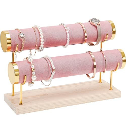 ProCase 2 våningar armbandshållare, avtagbar armbandshållare smyckeshållare, sammet wrap armbandstativ klockställ förvaring med träbas för armringar armband hårklämmor klockor – rosa
