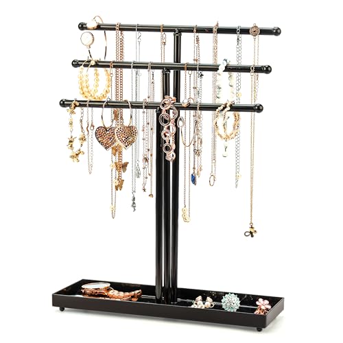 Belle Vous Svart Metall 3 Lager Smyckesuppvisningställ & Förvaring Basbricka Hållare – Träd Bordsyta Hängorganisatör – Hängare för Halsband, Armband, Ringar, Klockor & Örhängen
