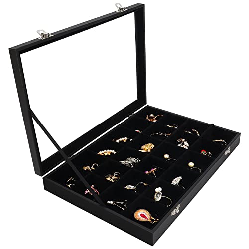 Belle Vous Smyckesorganisatörslåda Uppvisningslåda i Svart Sammet med 24 Delar & Glaslock – Staplingsbar Bricka för Låda – Justerbar Förvaring Rutnät för Ringar, Halsband, Armband, Örhängen & Klockor