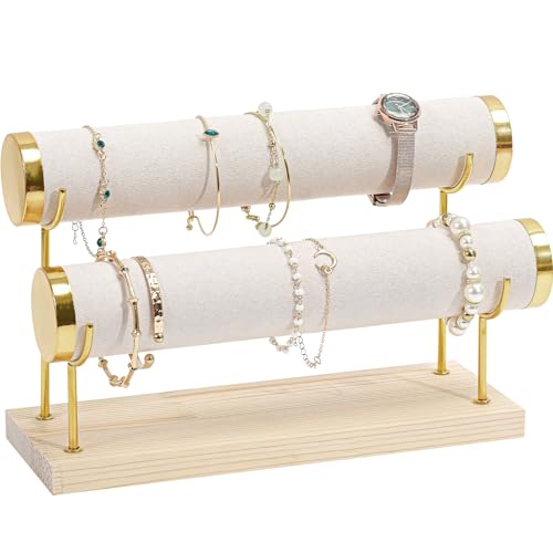 ProCase 2 våningar armbandshållare, avtagbar armbandshållare smyckeshållare, sammet wrap armbandstativ klockställ förvaring med träbas för armringar armband hårklämmor klockor – beige