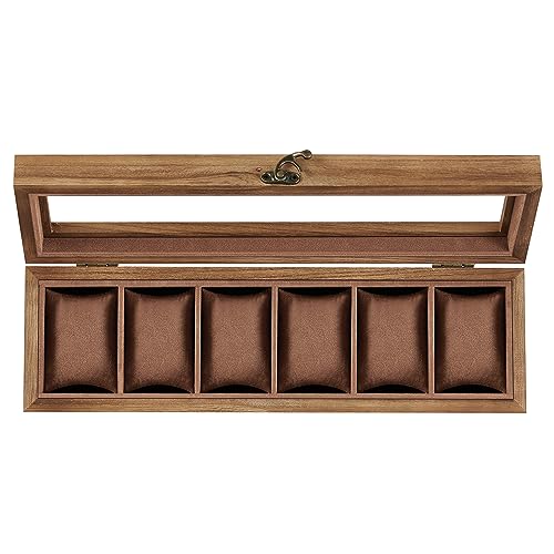 SONGMICS Klocklåda med 6 fack, klockfodral i massivt trä, klockbox, förvaring med stort glaslock, displaylåda med avtagbara kuddar för klockor, presentidé, rustik valnöt, JOW006K01
