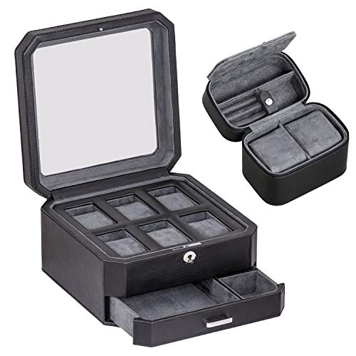 ProCase Klocklåda för män, sex fack med låda, fodral för herrklockor, med glaslock, två lager förvaring av smycken och klockor för män och kvinnor, sex fack,