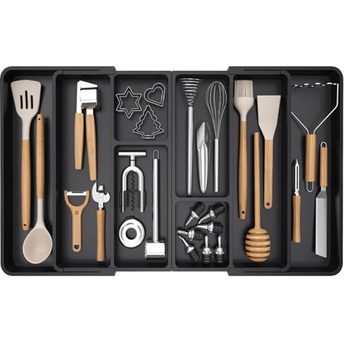 Lifewit Extra Large Besticklåda Organisatör, Utdragbar till 36 tum Bestickbricka för kök, Justerbar bestickhållare, plastbesticklåda, förvaring för köksredskap och och småsaker, Svart