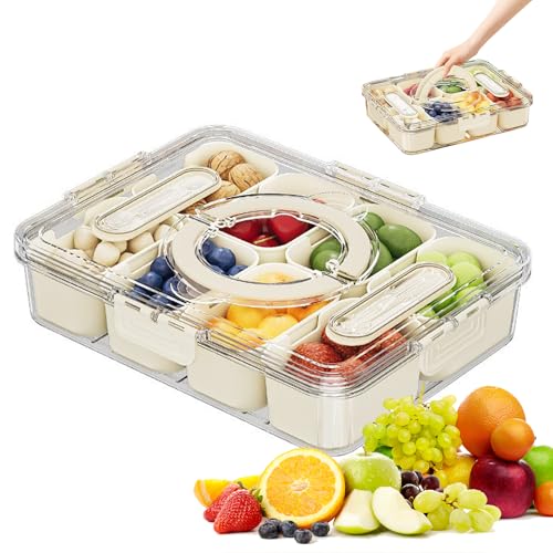 AKONE Snackslåda med fack, snacksskål med lock och handtag, 8/4-fack snackstallrik, återanvändbar snackslåda för förvaring av kryddor, snacks, godis, nötter, kex, frukt (8-fack)