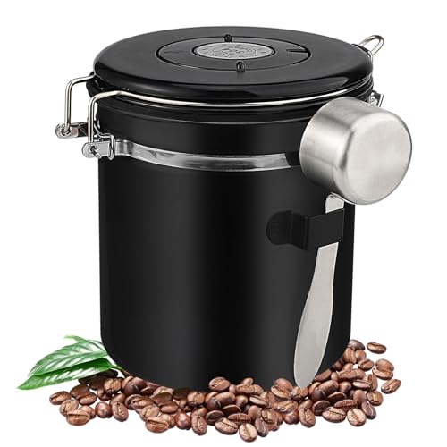 Hisdricus Kaffeburk (1,5 liter), lufttät kaffebehållare, rostfritt stålmaterial, inklusive sked, lämplig för förvaring av kaffebönor, kryddor, te och nötter (svart)