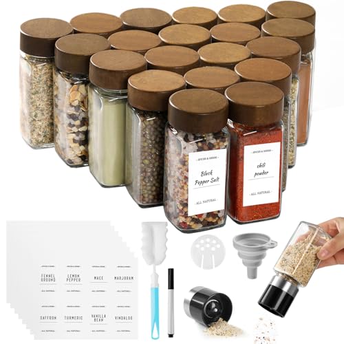 FRIBERG Set med 20 fyrkantiga kryddburkar i akaciaträ, 120ml, med 2 kryddkvarnar för förvaring av kryddor,kryddburkar i glas med kryddeetiketter