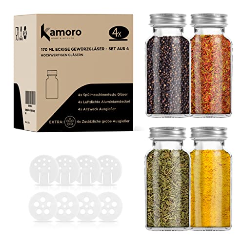 4 fyrkantiga kryddburkar för enkel förvaring av kryddor – tack vare extra stor kapacitet på 170 ml – 8 ströare i 2 former för enkel dosering