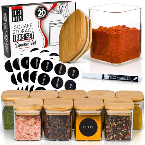 Deco haus® Fyrkantiga kryddburkar med kryddetiketter, set om 20 – set med kryddburkar med trälock, förvaringsburkar för dina kryddor, förvaring, kryddbehållare, behållare för kryddor