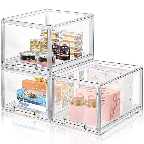 Vtopmart 4-pack stapelbara förvaringslådor, genomskinliga organisatörer av akryl med handtag, enkelt att montera för kylskåp, badrum, kök underhandfat, skåp, skafferi organisation och förvaring