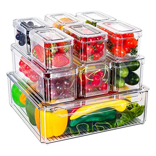 KAHEIGN 10 st kylorganisatörer, 3 storlekar klar stapelbar förvaringsfack BPA-fri plastbehållare för kök bänkskivor skåp kylskåp förvaring drycker frukt grönsaker spannmål