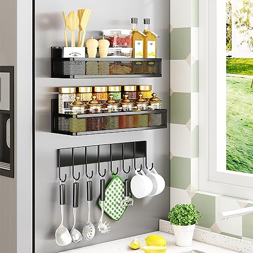 Miyawell Magnetisk kryddhylla för kylskåp, 3-pack magnetisk hylla, kylskåpsorganiseringshyllor för köksorganisering och förvaring, flyttbara kryddställ med 8 krokar, metall och svart