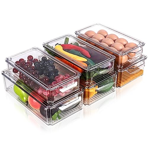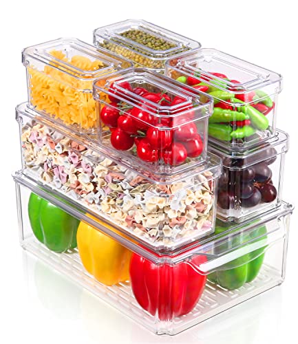 Kylskåpsorganisator förseglad 7 pack, stapelbar organisatör, 3 storlekar, genomskinlig med lock, med handtag, lämplig för kylskåp, köksskåp, skrivbord, sovrum, förvaring och förvaring, BPA-fri.