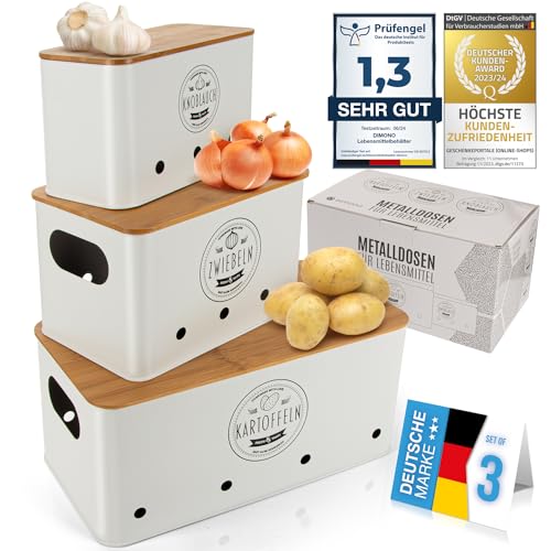 Dimono® förvaringslådor för grönsaker, set om 3; förvaringslåda i plåt; håller grönsaker färska längre, perfekt för lök, potatis och vitlök